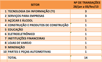 Com 46 transações ao longo do ano de 2012, o segmento de empresas de Alimentos,