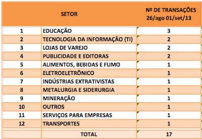No mês de agosto/13, foram anunciadas com destaque pela imprensa 69 operações de Fusões e