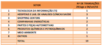 FUSÕES E AQUISIÇÕES – DESTAQUES DA SEMANA DE 29/ago a 04/set/16 5 de setembro de 201631 de outubro de 2020 Portal de Fusões e Aquisições Na semana de 29/ago a 04/set/16, foram anunciadas 19 operações de Fusões e Aquisições com
