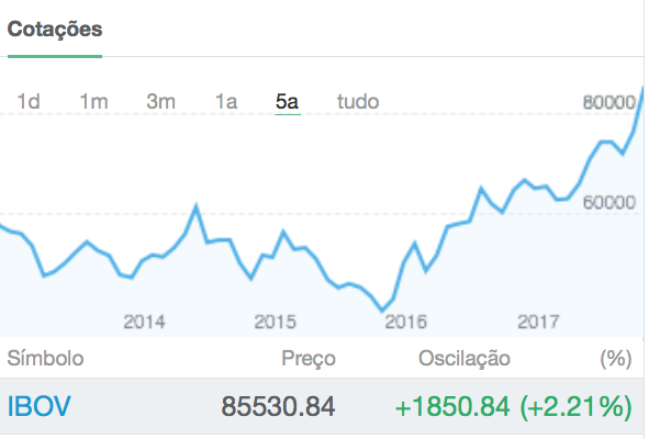 Ibovespa renova recorde acima de 85 mil pontos e já sobe 10% em 2018 26 de janeiro de 201831 de outubro de 2020 Portal de Fusões e Aquisições O principal índice de ações da B3 fechou na máxima do dia nesta sexta-feira, renovando