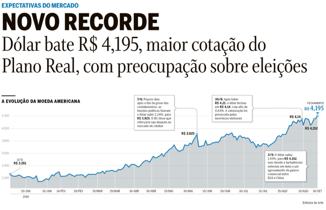 Novo recorde – o cenário eleitoral incerto acelerou a valorização do dólar 14 de setembro de 201831 de outubro de 2020 Portal de Fusões e Aquisições O cenário eleitoral incerto acelerou a valorização do dólar comercial, que atingiu R$4,195, a maior