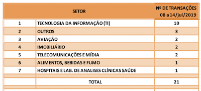 Fusões e Aquisições – destaques da semana 08 a 14/jul/2019 21 de julho de 201931 de outubro de 2020 Portal de Fusões e Aquisições Divulgadas 21 operações de Fusões e Aquisições com destaque pela imprensa na semana de 08