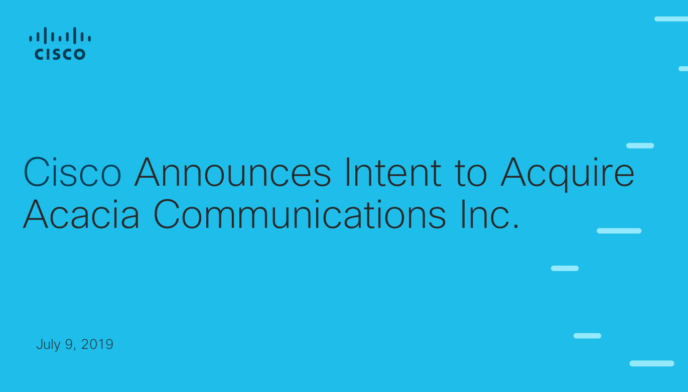 Cisco vai comprar Acacia Communications por US$2,8 bi 9 de julho de 201931 de outubro de 2020 Portal de Fusões e Aquisições A fabricante de equipamentos de rede Cisco anunciou nesta terça-feira que vai comprar a fabricante