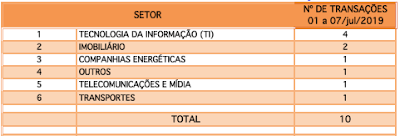 Fusões e Aquisições – destaques da semana 01 a 07/jul/2019 10 de julho de 201931 de outubro de 2020 Portal de Fusões e Aquisições Divulgadas 10 operações de Fusões e Aquisições com destaque pela imprensa na semana de 01