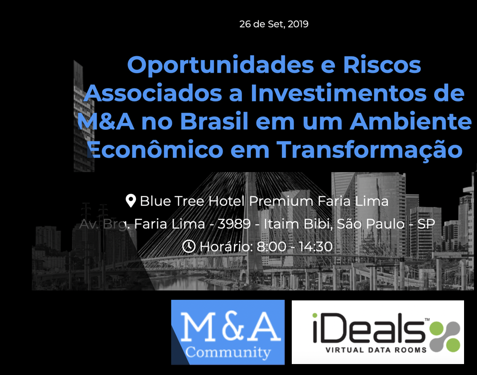 Oportunidades e riscos associados a Investimentos de M&A no Brasil em um ambiente econômico em transformação 12 de setembro de 201931 de outubro de 2020 Portal de Fusões e Aquisições A empresa iDeals Virtual Data Rooms estará realizando evento no próximo dia 26 de setembro