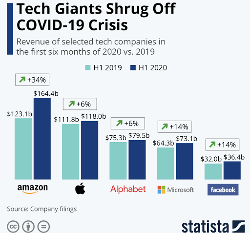 Gigantes da tecnologia ignoram a crise COVID-19 31 de julho de 202030 de outubro de 2020 Portal de Fusões e Aquisições Ao contrário das companhias aéreas, redes de hotéis, restaurantes e milhões de pequenas empresas que