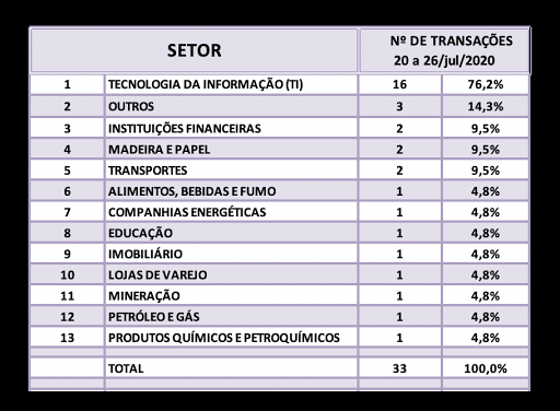 Fusões e Aquisições – destaques da semana 20 a 26/jul/2020 31 de julho de 202030 de outubro de 2020 Portal de Fusões e Aquisições Divulgadas 33 operações de Fusões e Aquisições com destaque pela imprensa na semana de 20