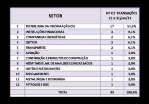 Fusões e Aquisições – destaques da semana 25 a 31/jan/2021 4 de fevereiro de 20212 de outubro de 2023 Portal de Fusões e Aquisições Divulgadas 33 operações de Fusões e Aquisições com destaque pela imprensa na semana de 25