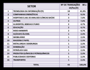 Fusões e Aquisições – semana 08 a 14/fev/20201 21 de fevereiro de 20212 de outubro de 2023 Portal de Fusões e Aquisições Divulgadas 43 operações de Fusões e Aquisições com destaque pela imprensa na semana de 08