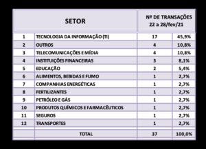 Humores & Rumores de M&A – 22 a 28/fev/2021 6 de março de 202129 de setembro de 2023 Portal de Fusões e Aquisições Principais notícias divulgadas na semana de 22 a 28/fev/2021 sobre negócios de fusões e aquisições