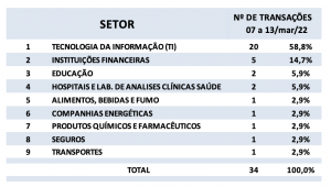 Fusões e Aquisições – destaques da semana 07 a 13/mar/2022 24 de março de 20222 de outubro de 2023 Portal de Fusões e Aquisições Divulgadas 34 operações de Fusões e Aquisições com destaque pela imprensa na semana de 07