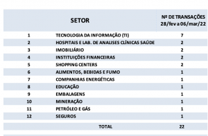 Fusões e Aquisições – destaques da semana 28/fev a 06/mar/2022 19 de março de 20222 de outubro de 2023 Portal de Fusões e Aquisições Divulgadas 22 operações de Fusões e Aquisições com destaque pela imprensa na semana de 28/fev