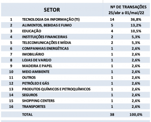 Fusões e Aquisições – destaques da semana 25/abr a 01/mai/2022 14 de maio de 20222 de outubro de 2023 Portal de Fusões e Aquisições Divulgadas 38 operações de Fusões e Aquisições com destaque pela imprensa na semana de 25/abr