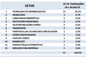 Fusões e Aquisições – destaques da semana 18 a 24/abr/2022 3 de maio de 20222 de outubro de 2023 Portal de Fusões e Aquisições Divulgadas 31 operações de Fusões e Aquisições com destaque pela imprensa na semana de 18