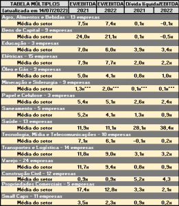 Múltiplos: EV/Ebitda por empresa e média do setor – julho/22 15 de julho de 202215 de julho de 2022 Portal de Fusões e Aquisições Atualização da tabela múltiplos para o mês de jul/22, EV/EBITDA e Dívida Líquida/EBITDA, de acordo