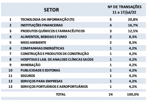 Fusões e Aquisições – destaques da semana 11 a 17/jul/2022 26 de julho de 20222 de outubro de 2023 Portal de Fusões e Aquisições Divulgadas 24 operações de Fusões e Aquisições com destaque pela imprensa na semana de 11