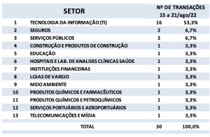 Fusões e Aquisições – destaques da semana 15 a 21/ago/2022 30 de agosto de 20222 de outubro de 2023 Portal de Fusões e Aquisições Divulgadas 30 operações de Fusões e Aquisições com destaque pela imprensa na semana de 15