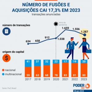Número de fusões e aquisições cai ao menor nível desde 2020 30 de janeiro de 2024 Portal de Fusões e Aquisições O número de fusões e aquisições no Brasil caiu 17,3% em 2023, segundo dados da