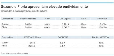 A composição do “firm value” das duas companhias realça o nível de alavancagem das companhias. A dívida líquida representa 66% e 60% do “firm value” de Suzano e Fibria, respectivamente.