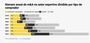 Fusões e aquisições esportivas aumentam 44% em 2024 7 de março de 2025 Portal de Fusões e Aquisições O private equity foi responsável por 45% das 410 transações na indústria esportiva nos últimos