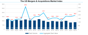 Fusões e aquisições nos EUA em setembro de 2024 : crescimento em volume e valores, 4,6% e 9,3% respectivamente 18 de outubro de 202420 de outubro de 2024 Portal de Fusões e Aquisições A atividade de M&A nos EUA aumentou 4,6% em setembro, com 986 anúncios em comparação
