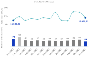 Fusões e Aquisições movimentam BRL 231,3 bi até nov/24, segundo o TTR Data 28 de dezembro de 2024 Portal de Fusões e Aquisições O cenário transacional brasileiro foi objeto de análise no relatório mensal do TTR Data, que