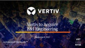 Vertiv compra grupo E&I Engineering por US$ 1,8 bilhão 14 de setembro de 2021 Portal de Fusões e Aquisições A Vertiv Holdings, fornecedora global de soluções para infraestrutura digital crítica e continuidade, anuncia que