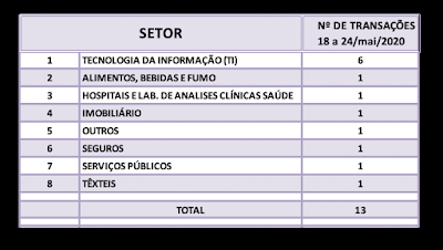 Fusões e Aquisições – destaques da semana 18 a 24/mai/2020 28 de maio de 202031 de outubro de 2020 Portal de Fusões e Aquisições Divulgadas 13 operações de Fusões e Aquisições com destaque pela imprensa na semana de 18