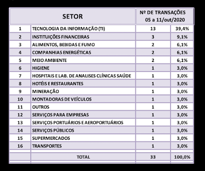 Fusões e Aquisições – destaques da semana 05 a 11/out/2020 13 de outubro de 202030 de outubro de 2020 Portal de Fusões e Aquisições Divulgadas 33 operações de Fusões e Aquisições com destaque pela imprensa na semana de 05