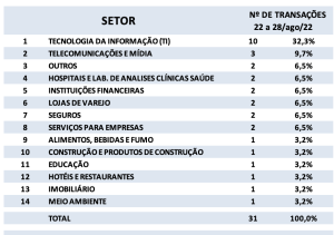 Fusões e Aquisições – destaques da semana 22 a 28/ago/2022 5 de setembro de 20222 de outubro de 2023 Portal de Fusões e Aquisições Divulgadas 31 operações de Fusões e Aquisições com destaque pela imprensa na semana de 22
