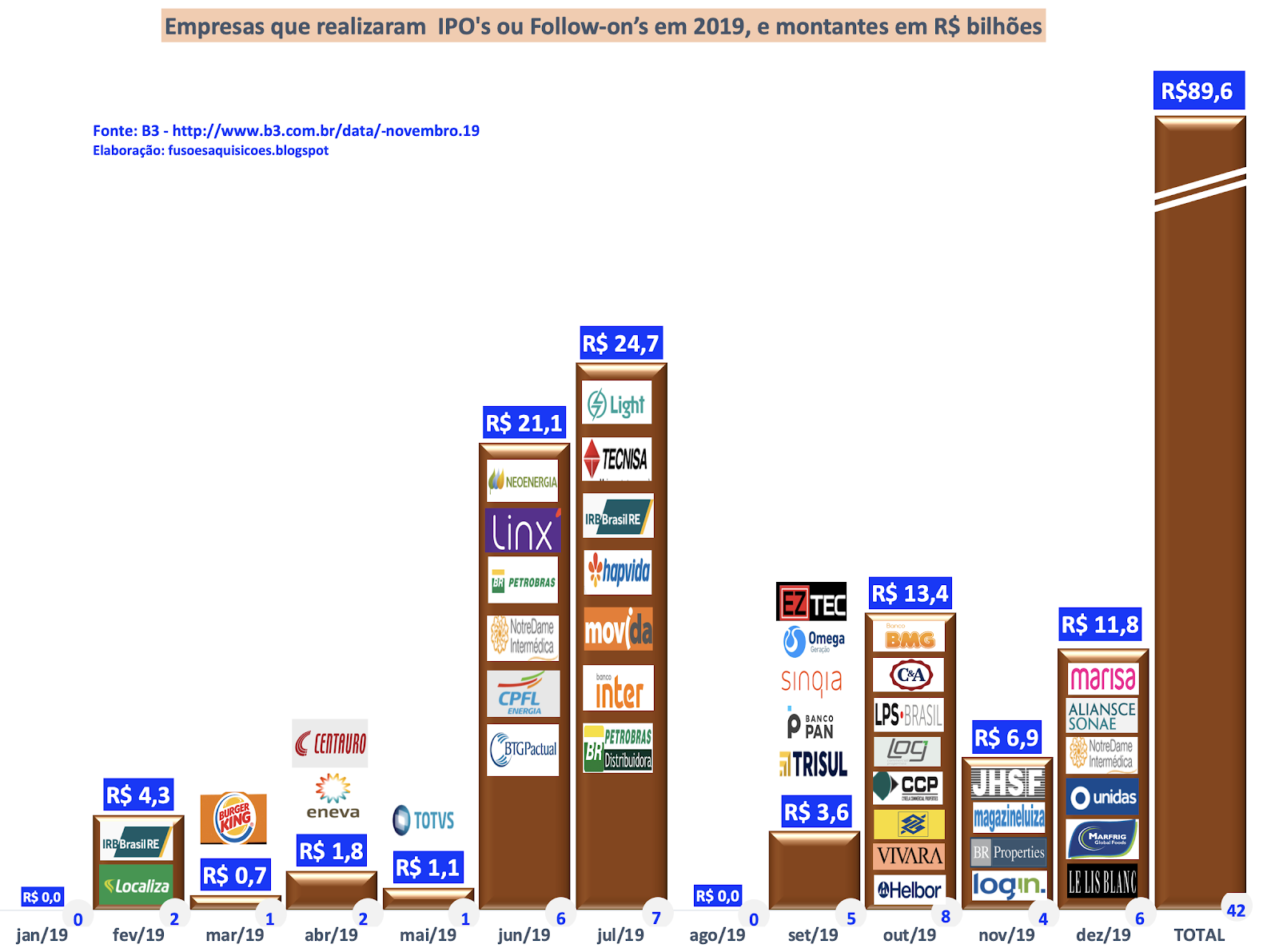 ATUALIZADO – Ofertas de ações por empresas brasileiras – IPOs e Follow-ons, em 2019 23 de dezembro de 201931 de outubro de 2020 Portal de Fusões e Aquisições Em 2019 foram realizadas 46 ofertas de ações por empresas brasileiras, no total de R$