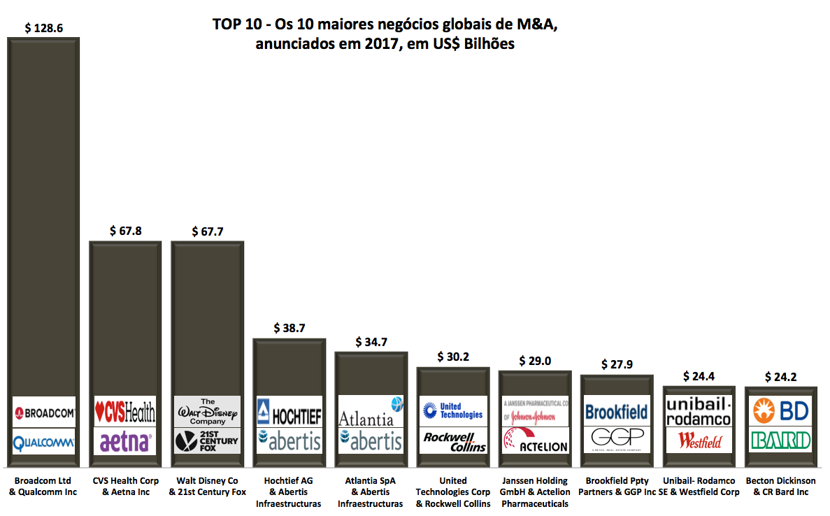 TOP 10 – Os 10 maiores negócios globais de M&A, anunciados em 2017 6 de janeiro de 201831 de outubro de 2020 Portal de Fusões e Aquisições A atividade global de fusões e aquisições superou US$ 3 trilhões pelo quarto ano seguido,