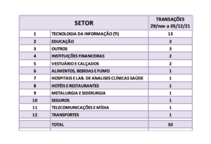 Fusões e Aquisições – destaques semana 29 a 05/dez/2021 18 de dezembro de 20212 de outubro de 2023 Portal de Fusões e Aquisições Divulgadas 30 operações de Fusões e Aquisições com destaque pela imprensa na semana de 29