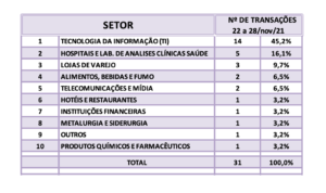 Fusões e Aquisições – destaques da semana 22 a 28/nov/2021 8 de dezembro de 20212 de outubro de 2023 Portal de Fusões e Aquisições Divulgadas 31 operações de Fusões e Aquisições com destaque pela imprensa na semana de 22