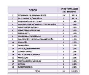 Fusões e Aquisições – destaques da semana 13 a 19/dez/2021 27 de dezembro de 20212 de outubro de 2023 Portal de Fusões e Aquisições Divulgadas 51 operações de Fusões e Aquisições com destaque pela imprensa na semana de 13