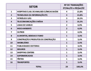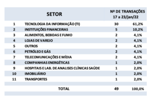 Fusões e Aquisições – destaques da semana 17 a 23/jan/2022 6 de fevereiro de 20222 de outubro de 2023 Portal de Fusões e Aquisições Divulgadas 49 operações de Fusões e Aquisições com destaque pela imprensa na semana de 17
