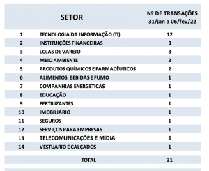 Fusões e Aquisições – destaques da semana 31/jan a 06/fev/2022 18 de fevereiro de 20222 de outubro de 2023 Portal de Fusões e Aquisições Divulgadas 31 operações de Fusões e Aquisições com destaque pela imprensa na semana de 31/jan