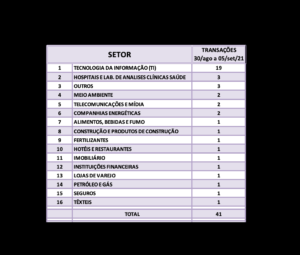 Fusões e Aquisições – destaques da semana 06 a 12/set/2021 19 de setembro de 20212 de outubro de 2023 Portal de Fusões e Aquisições Divulgadas 42 operações de Fusões e Aquisições com destaque pela imprensa na semana de 06