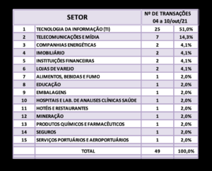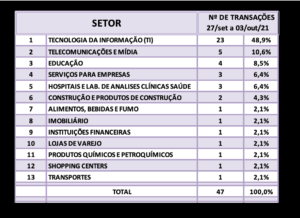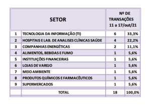 Fusões e Aquisições – destaques da semana 18 a 24/out/2021 3 de novembro de 20212 de outubro de 2023 Portal de Fusões e Aquisições Divulgadas 60 operações de Fusões e Aquisições com destaque pela imprensa na semana de 18
