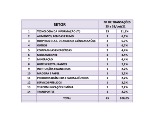 Fusões e Aquisições – destaques da semana 13 a 19/set/2021 25 de setembro de 20212 de outubro de 2023 Portal de Fusões e Aquisições Divulgadas 31 operações de Fusões e Aquisições com destaque pela imprensa na semana de 13