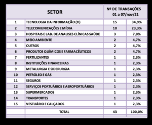 Fusões e Aquisições – destaques da semana 01 a 07/nov/2021 18 de novembro de 20212 de outubro de 2023 Portal de Fusões e Aquisições Divulgadas 43 operações de Fusões e Aquisições com destaque pela imprensa na semana de 01