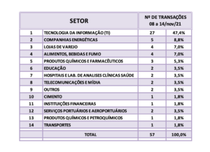Fusões e Aquisições – destaques da semana 08 a 14/nov/2021 21 de novembro de 20212 de outubro de 2023 Portal de Fusões e Aquisições Divulgadas 56 operações de Fusões e Aquisições com destaque pela imprensa na semana de 08