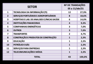 Fusões e Aquisições – destaques da semana 05 a 11/abr/2021 13 de abril de 20212 de outubro de 2023 Portal de Fusões e Aquisições Divulgadas 43 operações de Fusões e Aquisições com destaque pela imprensa na semana de 05