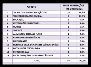 Fusões e Aquisições – destaques da semana 03 a 09/mai/2021 16 de maio de 20212 de outubro de 2023 Portal de Fusões e Aquisições Divulgadas 36 operações de Fusões e Aquisições com destaque pela imprensa na semana de 03