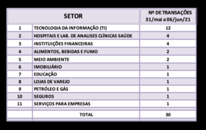 Fusões e Aquisições – destaques da semana 31mai/ a 06/jun2021 13 de junho de 20212 de outubro de 2023 Portal de Fusões e Aquisições Divulgadas 30 operações de Fusões e Aquisições com destaque pela imprensa na semana de 31/mai