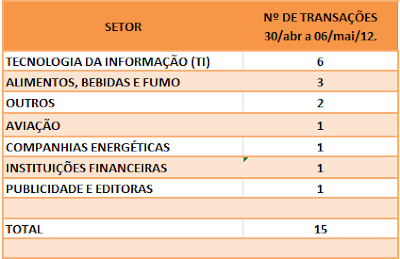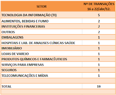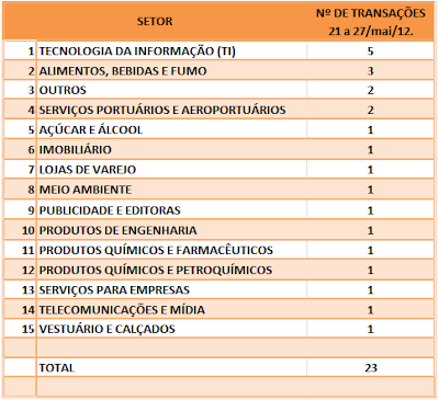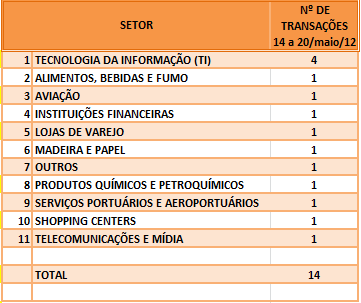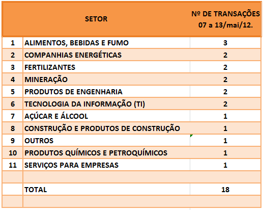 FUSÕES E AQUISIÇÕES – DESTAQUES DA SEMANA DE 07/mai a 13/mai/12 14 de maio de 20122 de outubro de 2023 Portal de Fusões e Aquisições Divulgadas 18 operações de Fusões e Aquisições com destaque pela imprensa, na semana de 07/mai