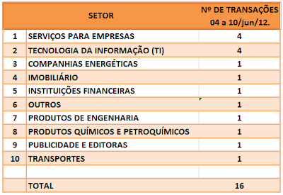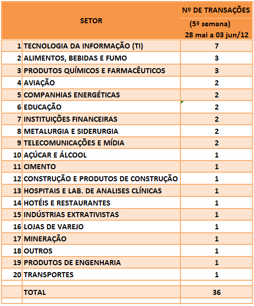 FUSÕES E AQUISIÇÕES – DESTAQUES DA SEMANA DE 28/mai a 03/jun/12. 5 de junho de 20122 de outubro de 2023 Portal de Fusões e Aquisições Divulgadas 36 operações de Fusões e Aquisições com destaque pela imprensa, na semana de 28/mai