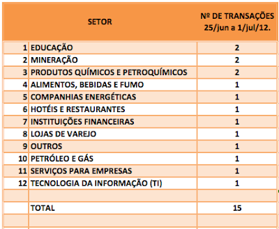 FUSÕES E AQUISIÇÕES – DESTAQUES DA SEMANA DE 25/jun a 01/jul/12 3 de julho de 201231 de outubro de 2020 Portal de Fusões e Aquisições Divulgadas 15 operações de Fusões e Aquisições com destaque pela imprensa, na semana de 25/jun