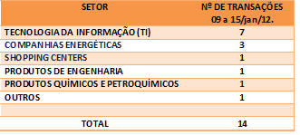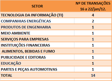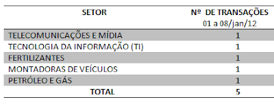 FUSÕES E AQUISIÇÕES – DESTAQUES DA SEMANA DE 01 a 08/jan/12. 9 de janeiro de 201231 de outubro de 2020 Portal de Fusões e Aquisições Operações de Fusões e Aquisições divulgadas com destaque pela imprensa no decorrer da semana de