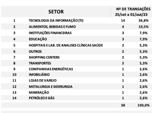 Fusões e Aquisições – resumo da semana 25/set a 01/out/2023 19 de outubro de 2023 Portal de Fusões e Aquisições Divulgadas 38 operações de Fusões e Aquisições com destaque pela imprensa na semana 25/set a